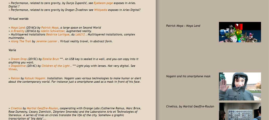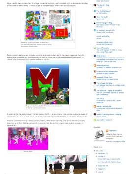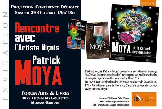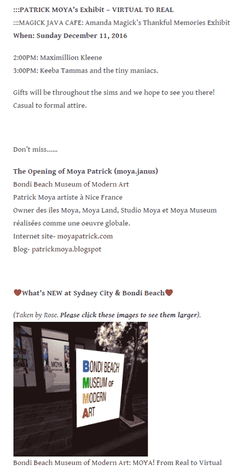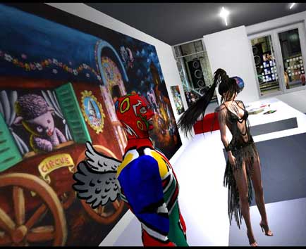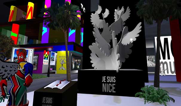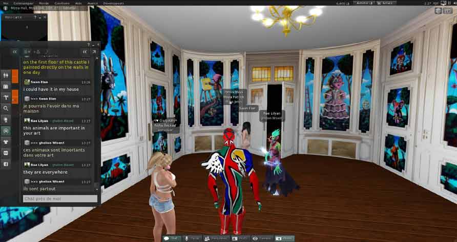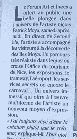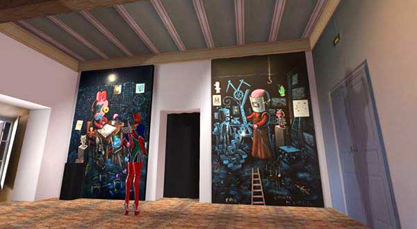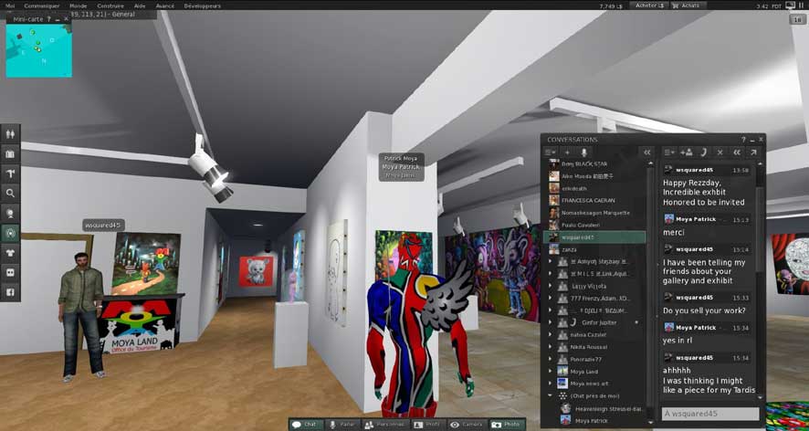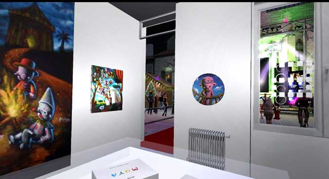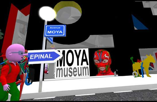 Moya. Esta semana tuve una de mis mejores experiencias en Secondlife, como ustedes saben desde mis inicios me ha gustado explorar encontrar lugares interesantes, con diferente temática, pero sin duda los que más me agradan son todos los sitios de arte y los cuales con el paso de los años han evolucionado al ritmo que la tecnología o el mismo mundo virtual lo permite. El pasado fin de semana a altas horas de la madrugada y sin tener sueño decidí entrar a SL y explorar encontré un espacio llamado Studio Moya al llegar pude ver que no era una sola galería y ni siquiera un solo sim, si no que son 4 sims llamados Moya Land, Studio Moya, Moya y Moya Museum en los cuales podemos admirar el trabajo del artista Patrick Moya. Me dejo gratamente sorprendida su trabajo, así que decidí regresar en la semana para tomar fotografías y hacer algún video, cuando volví mi grata sorpresa fue que el artista Patrick Moya se encontraba en el sitio con su avatar quien amablemente me dio un tour por el lugar donde me explico a detalle su trabajo, desde sus inicios y hasta la actualidad, sin duda he tenido una gran experiencia y honor en conocerlo. Son de las maravillas del mundo virtual poder vivir el arte y conocer al artista que está del otro lado del mundo, situaciones que en la vida real serían muy difícil de lograr. Patrick Moya es un artista francés pintor, escultor, artista digital, virtual, performance y escritor; vive en la Ciudad de Niza en Francia, estudio en Villa Arson (Escuela Nacional de Finas Artes en Niza) y hasta la fecha ha creado un sinfín de obras de arte, escrito libros y realizado diferentes proyectos los cuales podemos apreciar en esta muestra virtual. Desde los años 70s ha estado a la vanguardia en las últimas formas de medio de comunicación y tecnología en beneficio del arte. Se le considera uno de los pioneros del videoarte. Inspirado por la teoría de Marshall McLuhan creo un programa de televisión llamado Bonzour Bonzour donde es un artista de Tv. (El mensaje es el medio, el medio es el artista, yo soy el medio). Llego a Second Life desde el 2007. Ha llevado su trabajo a diferentes lugares del mundo (Corea del Sur, Taiwan, Hong Kong, Italia, Niza, Paris, Cannes), su obra ha sido plasmada en diferentes lugares y objetos, desde autos que han participado en el gran premio de Montecarlo, Capillas, en hospitales, autobuses, accesorios y hasta en la moda. En sus inicios fue modelo nudista para otros pintores en las escuelas de arte. Desde sus inicios en el mundo de arte el maneja la teoría de que el artista debe vivir en su obra de arte cosa que como me explico en Second life es posible vivir en su arte, en SL ha creado su propio mundo con su imaginación, con sus personajes, con su arte, Me siento muy identificada con esta idea, siempre lo repito cuando visito diferentes lugares con obras de diferentes artistas, es increíble la posibilidad que nos da SL de poder no solo ver el arte si no entrar en el arte. Como les comenté al inicio tuve un tour personalizado el cual grabe y quiero compartir con ustedes, me tome la libertad de crear dos videos uno con el tour y uno más solo con imágenes. " |