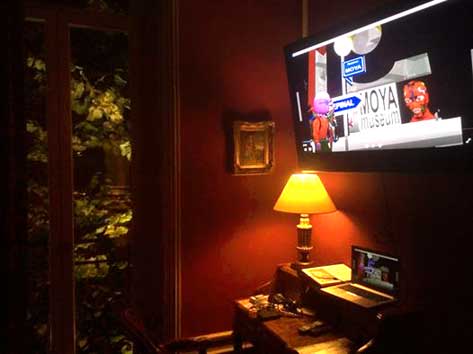 "pose de la maquette du château de Lamazière pour la prochaine expo à Cormeilles en Parisis (vernissage le 6 janvier) Chapichapo Delvalle me prend avec son taxi pour aller dans le laboratoire du Studio Moya où se fabriquent les maquettes .On pose la château pour préparer l'expo grâce à la maquette ce qui permet d'organiser un vernissage virtuel lundi soir qui sera filmé et diffusé dans l'expo réelle - petite précision Chapi ne parle jamais en voice mais uniquement par chat écrit."