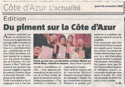 Librairie Masséna Nice - présentation dédicace de "La Cote d'Azur vue du sexe - abécédaire coquin" de Faustine Sappa et Bertrand Roussel illustré par Patrick Moya (Edition Gilletta)
