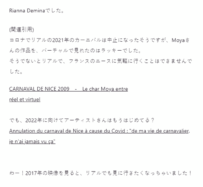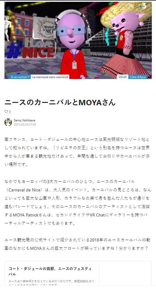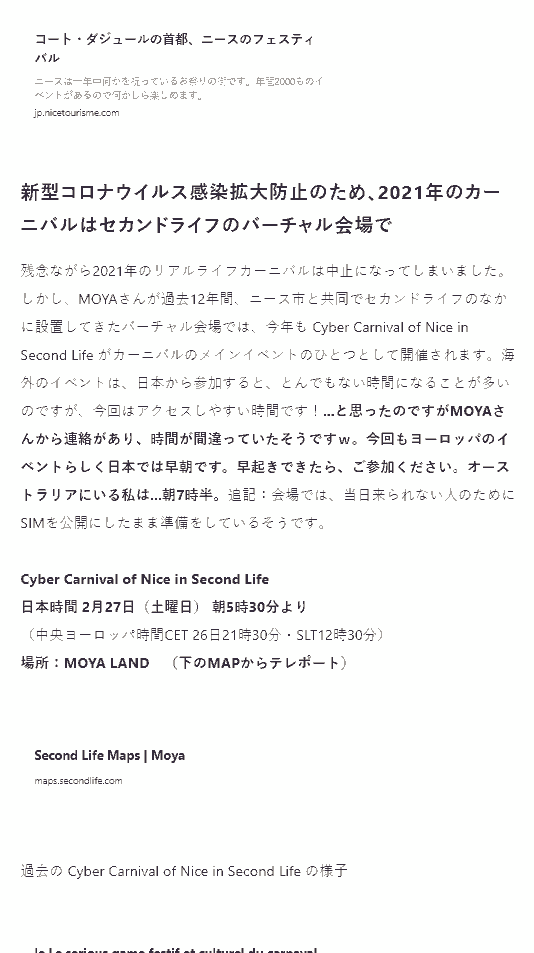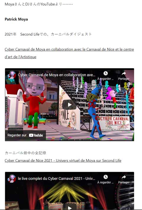 Je suis allé voir le carnaval au musée MOYA dans Second Life, qui se tient actuellement J'aime beaucoup la vision du monde de MOYA le matin - Quand je suis arrivé au SIM, j'ai été submergé par les couleurs incroyables. Le personnage à lunettes est le personnage de l'auteur lui-même.En fait, il était aussi un avatar. - Je suis un carnaval flashy et je continue de m'exciter. Mon ami Dolphin Q-chan, qui participe au carnaval. C'est un joli challenge. - DJ Raven SoundDDoll doit être un vrai professionnel ! Le carnaval où le personnage de MOYA a défilé était le meilleur ! (En fait, tôt le matin au Japon) |