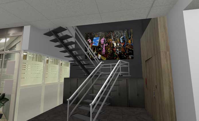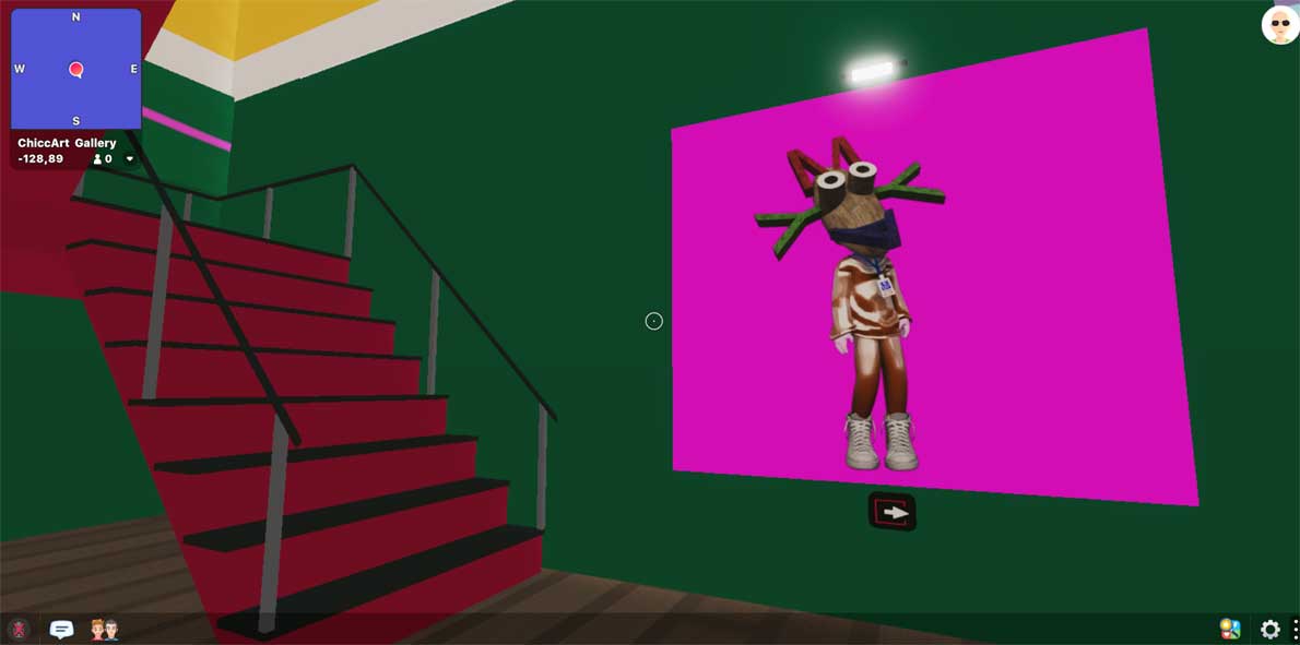 Un vernissage de la galerie ChiccArt sur Decentraland qui représente Patrick Moya sur cet univers