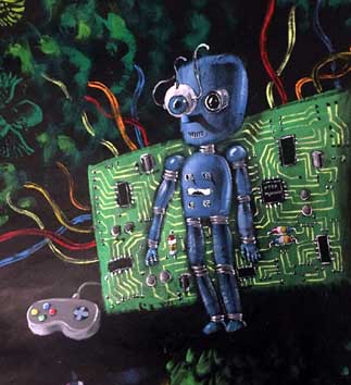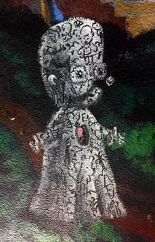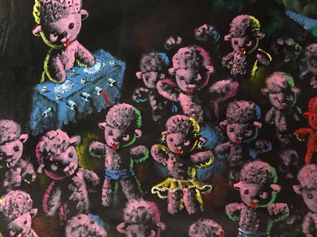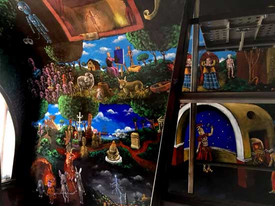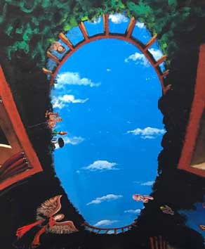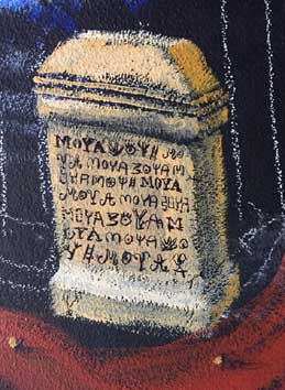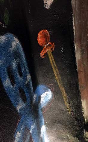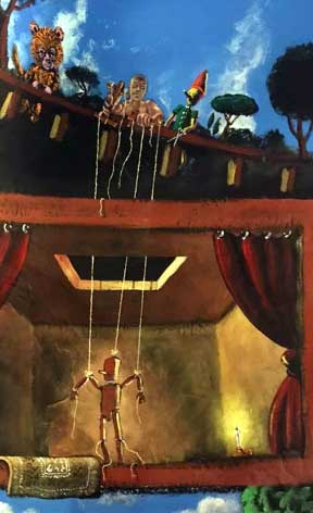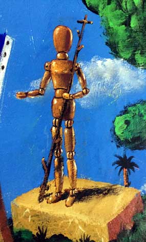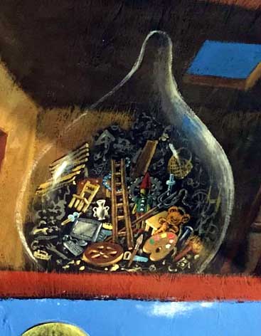 LOCULUS Le Moya Land est au balcon, un univers complet et reconnaissable, comme dans une des oeuvres peintes de lartiste : Dolly, bien sûr, mais aussi lâne, le singe, lours Sans oublier la Moya Tower et un auto-portait de lartiste en marionnettiste IL faut ici y ajouter les trois croix : allusion à Jesus en croix, entouré de deux « larrons » ou croyants suppliciés avec lui, suivant les versions « Lorsquils furent arrivés au lieu appelé Crâne, ils le crucifièrent là, ainsi que les deux malfaiteurs, lun à droite, lautre à gauche. » Luc 23, 33. |