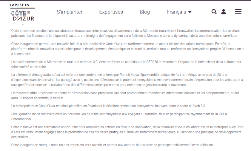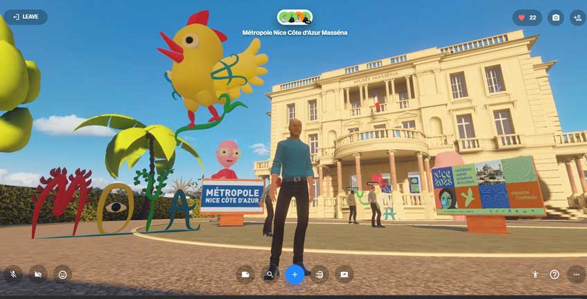 "Nice, première métropole de France à investir le Metaverse !Dans le cadre de la candidature Nice 2028, le Musée Masséna a ouvert ses portes virtuelles sur "Spatial.io", afin de mettre en lumière le rayonnement culturel de notre cité dans cet espace virtuel. Une innovation soutenue par Patrick Moya, artiste niçois précurseur et expert dans l'utilisation des mondes virtuels au service de l'art, qui donne son éclairage sur les apports que le Metaverse peut apporter à la Culture, et permettre à la Ville de Nice de connecter l'inattendu.Dès maintenant, nous vous invitons à vous rendre sur l'espace de la Métropole Nice Côte d'Azur et découvrir les expositions des musées de la Ville de Nice ainsi que quelques oeuvres numériques de Patrick Moya."