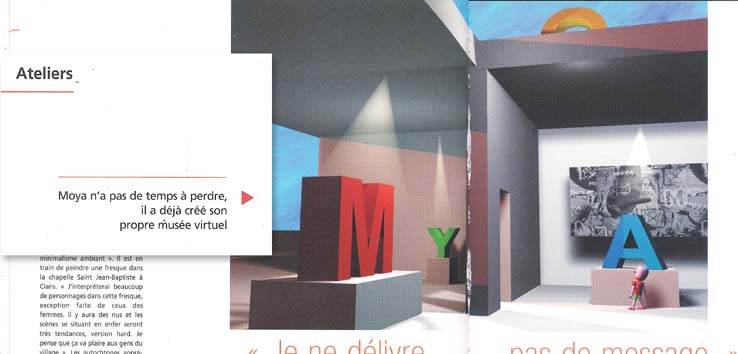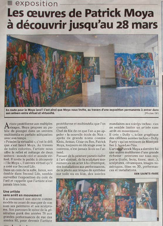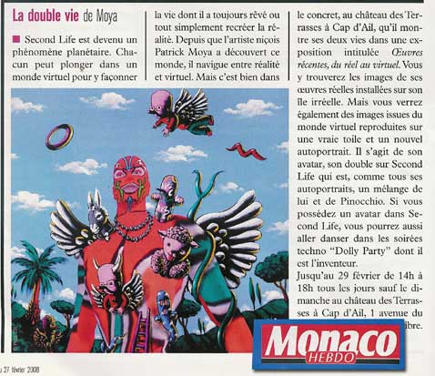 Moya. Esta semana tuve una de mis mejores experiencias en Secondlife, como ustedes saben desde mis inicios me ha gustado explorar encontrar lugares interesantes, con diferente temática, pero sin duda los que más me agradan son todos los sitios de arte y los cuales con el paso de los años han evolucionado al ritmo que la tecnología o el mismo mundo virtual lo permite. El pasado fin de semana a altas horas de la madrugada y sin tener sueño decidí entrar a SL y explorar encontré un espacio llamado Studio Moya al llegar pude ver que no era una sola galería y ni siquiera un solo sim, si no que son 4 sims llamados Moya Land, Studio Moya, Moya y Moya Museum en los cuales podemos admirar el trabajo del artista Patrick Moya. Me dejo gratamente sorprendida su trabajo, así que decidí regresar en la semana para tomar fotografías y hacer algún video, cuando volví mi grata sorpresa fue que el artista Patrick Moya se encontraba en el sitio con su avatar quien amablemente me dio un tour por el lugar donde me explico a detalle su trabajo, desde sus inicios y hasta la actualidad, sin duda he tenido una gran experiencia y honor en conocerlo. Son de las maravillas del mundo virtual poder vivir el arte y conocer al artista que está del otro lado del mundo, situaciones que en la vida real serían muy difícil de lograr. Patrick Moya es un artista francés pintor, escultor, artista digital, virtual, performance y escritor; vive en la Ciudad de Niza en Francia, estudio en Villa Arson (Escuela Nacional de Finas Artes en Niza) y hasta la fecha ha creado un sinfín de obras de arte, escrito libros y realizado diferentes proyectos los cuales podemos apreciar en esta muestra virtual. Desde los años 70s ha estado a la vanguardia en las últimas formas de medio de comunicación y tecnología en beneficio del arte. Se le considera uno de los pioneros del videoarte. Inspirado por la teoría de Marshall McLuhan creo un programa de televisión llamado Bonzour Bonzour donde es un artista de Tv. (El mensaje es el medio, el medio es el artista, yo soy el medio). Llego a Second Life desde el 2007. Ha llevado su trabajo a diferentes lugares del mundo (Corea del Sur, Taiwan, Hong Kong, Italia, Niza, Paris, Cannes), su obra ha sido plasmada en diferentes lugares y objetos, desde autos que han participado en el gran premio de Montecarlo, Capillas, en hospitales, autobuses, accesorios y hasta en la moda. En sus inicios fue modelo nudista para otros pintores en las escuelas de arte. Desde sus inicios en el mundo de arte el maneja la teoría de que el artista debe vivir en su obra de arte cosa que como me explico en Second life es posible vivir en su arte, en SL ha creado su propio mundo con su imaginación, con sus personajes, con su arte, Me siento muy identificada con esta idea, siempre lo repito cuando visito diferentes lugares con obras de diferentes artistas, es increíble la posibilidad que nos da SL de poder no solo ver el arte si no entrar en el arte. Como les comenté al inicio tuve un tour personalizado el cual grabe y quiero compartir con ustedes, me tome la libertad de crear dos videos uno con el tour y uno más solo con imágenes. " |