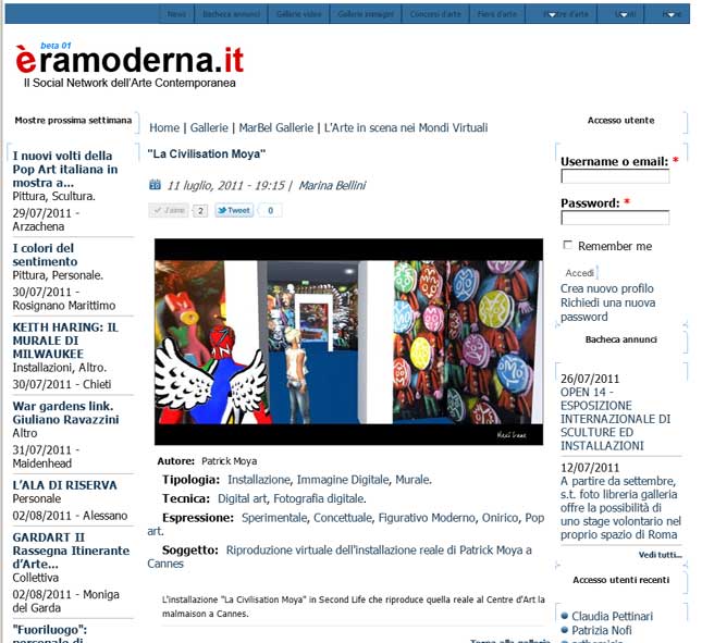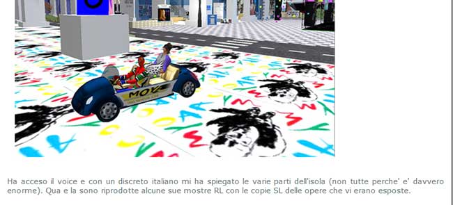 la traduction française du passage : "Mais si nous pensons que Second Life est mort, nous nous trompons. C'est un univers toujours actif, basé sur un noyau dur d'utilisateurs. « A la base du délire collectif, il y avait la nouveauté, bien sûr, mais aussi l'introduction d'une monnaie virtuelle, le Linden Dollar, qui permettait tout type d'échanges et d'échanges en argent réel », explique Mario Gerosa, journaliste, parmi les principaux experts de Second Life en Espagne, un sujet qu'il met à jour sur son blog Virtual Vernissage. "Aujourd'hui dans SL il y a surtout des graphistes, des designers, des personnes expérimentées capables d'exploiter le potentiel de la plateforme", qui ne sont pas rares et n'ont jamais été aussi simples et immédiats à utiliser, comme la presse l'avait suggéré. Comme exemple d'utilisateur qui a compris le potentiel du médium, Gerosa cite Patrick Moya, un artiste français,..." |