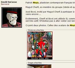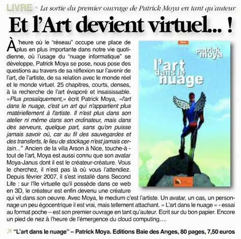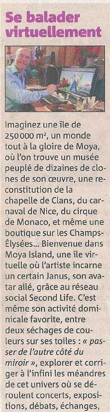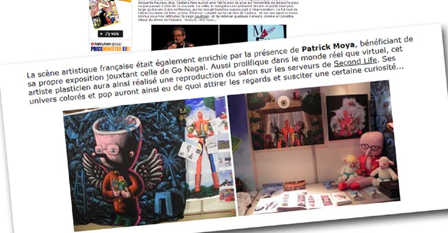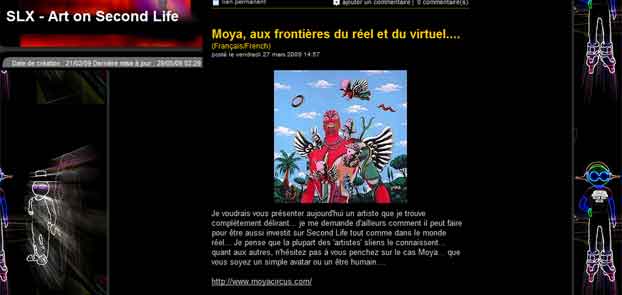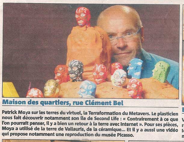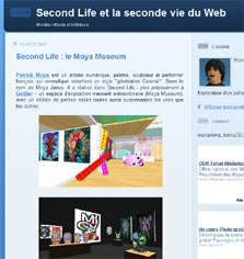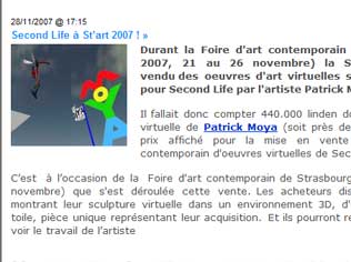 Durant la Foire d'art contemporain de Strasbourg (St'Art 2007, 21 au 26 novembre) la Shimoni Gallery aura vendu des oeuvres d'art virtuelles spécifiquement créées pour Second Life par l'artiste Patrick Moya. Il fallait donc compter 440.000 linden dollars pour cette oeuvre virtuelle de Patrick Moya (soit près de 1.200 euros) : c'est le prix affiché pour la mise en vente dans une foire d'art contemporain d'oeuvres virtuelles de Second Life. Cest à loccasion de la Foire d'art contemporain de Strasbourg (St'Art 2007, 21 au 26 novembre) que s'est déroulée cette vente. Les acheteurs disposeront outre un DVD montrant leur sculpture virtuelle dans un environnement 3D, d'un tirage numérique sur toile, pièce unique représentant leur acquisition. Et ils pourront retourner sur Moya Island voir le travail de lartiste