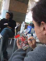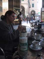 | Laveri, Moya et Alpi au Bar "Il Miglio Verde" (association d'anciens détenus) - les tables sont dans des cellules |
