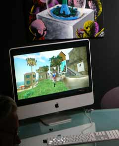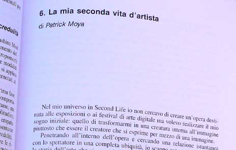 Nel mio universo in Second Life io non cercavo di creare unopera destinata alle esposizioni o ai festival di arte digitale ma volevo realizzare il mio sogno iniziale: quello di trasformarmi in una creatura interna allimmagine piuttosto che essere il creatore che si esprime per mezzo di una immagine. Penetrando allinterno dellopera e cercando una relazione istantanea con lo spettatore in una completa ubiquità, io scappo automaticamente dalla storia dellarte che si costruisce sulla differenza fra il tempo della creazione e quello della diffusione dellopera nel racconto della durata della trasmissione e della fabbricazione dellopera stessa. Nel mondo virtuale di Second Life io sono un secondo artista e, se può sembrare che vi realizzi delle opere, queste non hanno alcun interesse artistico se non listantaneità della relazione che rende inutile raccontarne il processo. Gli oggetti, le installazioni o le performance presentate nellisola di Moya che assomigliano a opere non sono che elementi equivalenti agli alberi o alle nuvole in un quadro figurativo. Questi oggetti virtuali servono come decoro immersivo nella mia seconda vita dartista. Lintuizione dellarte contemporanea che tutto è arte era difficile da concretizzare in un mondo fisico dove la messa in scena museale ridava ad ogni oggetto un carattere sacro. Il mondo virtuale dà a questa idea tutto il suo senso combinando lidea che niente e tutto è arte e che finalmente larte è là dove lartista si trova. Lisola di Moya non ha bisogno di essere sacralizzata da una presentazione museale perché, essendo immersa nel suo centro, per conoscerla non la si vede dallesterno. Second Life, permettendomi di vivere allinterno dellopera la metà del mio tempo e, soprattutto, di incontrare il pubblico, è ora il mezzo che più mi avvicina al mio scopo finale.