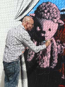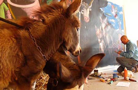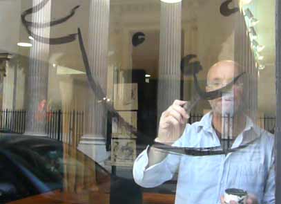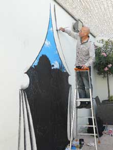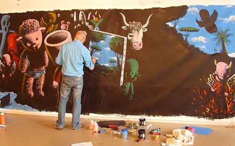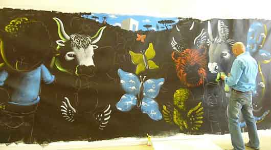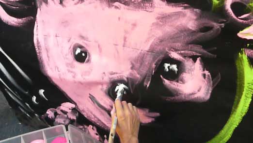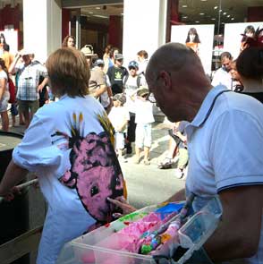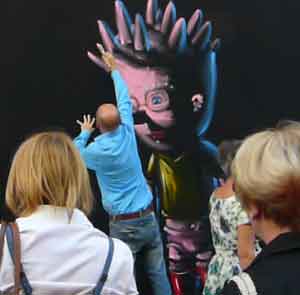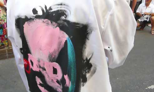 | peinture en live à reculons sur les blouses de "Clowns z'Hopitaux | ||