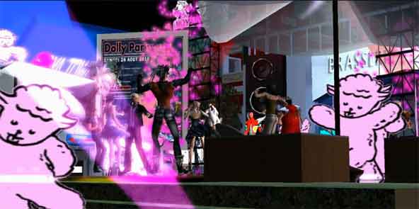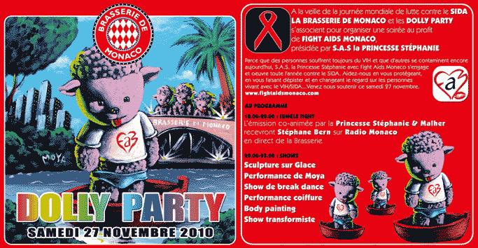 | La soirée Dolly Party pour Fight Aids Monaco dans l'univers virtuel de Moya de Second Life sur les grands écrans de la Brasserie de Monaco | |||||||