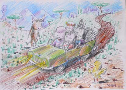 | Chez le collectionneur Mario Bavato - un dessin pour Mario "Mario transporte le Moya land" | |
