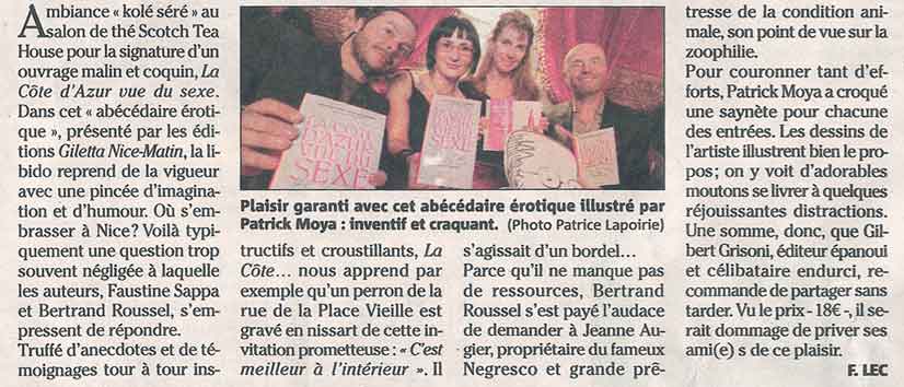 Librairie Masséna Nice - présentation dédicace de "La Cote d'Azur vue du sexe - abécédaire coquin" de Faustine Sappa et Bertrand Roussel illustré par Patrick Moya (Edition Gilletta)
