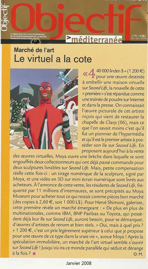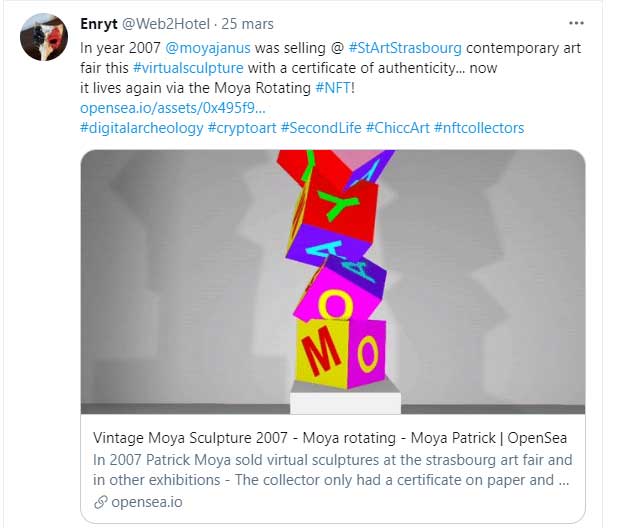 In 2007 Patrick Moya sold virtual sculptures at the strasbourg art fair and in other exhibitions - The collector only had a certificate on paper and a digital copy on canvas. there are still unsold sculptures which are now offered thanks to the NFT.
