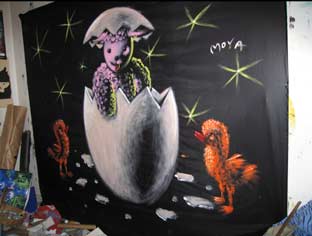 | Toiles, grandes bâches, toiles et dessins pour les flyers des soirées, flyers et films | ||