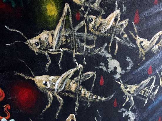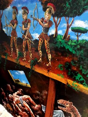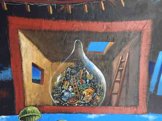 LOCULUS Le Moya Land est au balcon, un univers complet et reconnaissable, comme dans une des oeuvres peintes de lartiste : Dolly, bien sûr, mais aussi lâne, le singe, lours Sans oublier la Moya Tower et un auto-portait de lartiste en marionnettiste IL faut ici y ajouter les trois croix : allusion à Jesus en croix, entouré de deux « larrons » ou croyants suppliciés avec lui, suivant les versions « Lorsquils furent arrivés au lieu appelé Crâne, ils le crucifièrent là, ainsi que les deux malfaiteurs, lun à droite, lautre à gauche. » Luc 23, 33. |