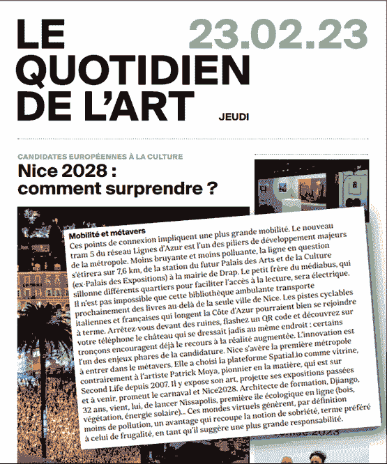 "Nice, première métropole de France à investir le Metaverse !Dans le cadre de la candidature Nice 2028, le Musée Masséna a ouvert ses portes virtuelles sur "Spatial.io", afin de mettre en lumière le rayonnement culturel de notre cité dans cet espace virtuel. Une innovation soutenue par Patrick Moya, artiste niçois précurseur et expert dans l'utilisation des mondes virtuels au service de l'art, qui donne son éclairage sur les apports que le Metaverse peut apporter à la Culture, et permettre à la Ville de Nice de connecter l'inattendu.Dès maintenant, nous vous invitons à vous rendre sur l'espace de la Métropole Nice Côte d'Azur et découvrir les expositions des musées de la Ville de Nice ainsi que quelques oeuvres numériques de Patrick Moya."