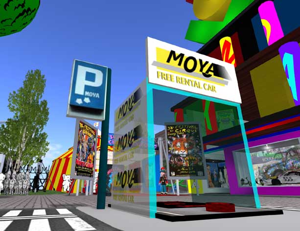 Moya Free Car Ce service permet à tous les visiteurs d'emprunter une voiture par un simple click afin de visiter l'île. En cas d'abandon de l'automobile ou d'accident, le véhicule revient instantanément à son point d'origine. Ce service unique sur Second Life est particulièrement apprécié des touristes exigeants.